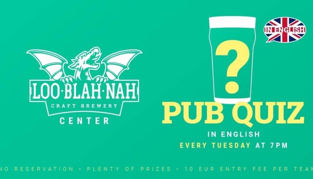 Pub Loo-Blah-Nah CenterAfter the success of our Pub Quiz nights in Slovene, we have decided to add an ENGLISH version. Every Tuesday evening at 7 PM you are invited to a brain workout where we will tackle life's more or less important issues. Under the guidance of our Quizmaster, teams of 2 to 4 people compete in four sets of questions, and the best two teams are awarded with rich prizes. No registration is required and the entry fee for the Pub Quiz in ENGLISH is 10 EUR per team.