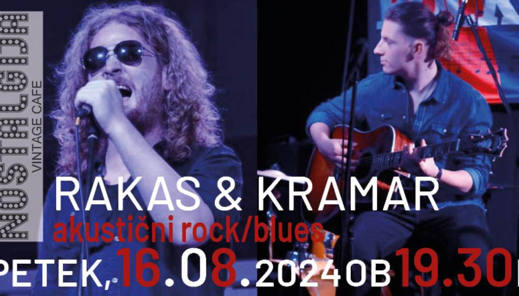 Krakovski nasip 4, 1000 LjubljanaRakas & Kramar je akustični rock/blues duo iz Zagreba. Njihov glasbeni opus sega predvsem v rock glasbo 70. in 80. let, kot so Led Zeppelin, Deep Purple, Whitesnake itd. Mladen Rakas je kot pevec pod vplivom blues pevcev, kot so Paul Rodgers, David Coverdale, kitarist Luka Kramar pa je pod vplivom kitaristov, kot so Nuna Bettencourt, Phil X in podobni.