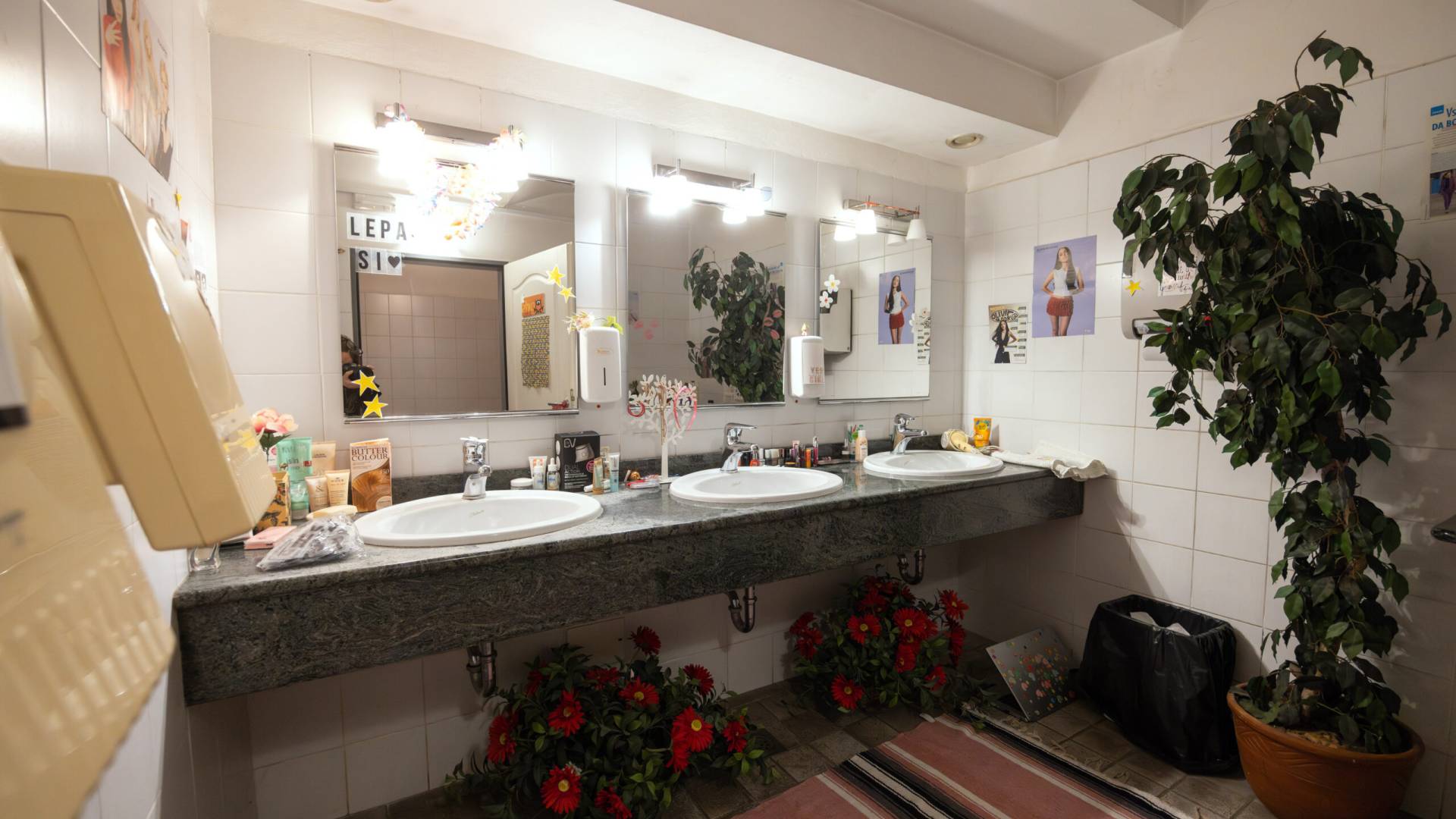 Čarna Lampret in Ajda Pirtovšek z instalacijo Rožice in pivo z gesto subverzivne afirmacije poudarita spolno stereotipne delitve. Z instalacijo na straniščih zaostrita spolno delitev edinega prostora v Stari elektrarni, ki predpisuje ločitev glede na spol.Prav v to preostalo delitev je treba dregniti in z gesto izpostaviti spolno zaznamovanost prostorov, odkrite stereotipe in zakrite, s spolom povezane strahove družbe. Ali kot hudomušno pravita avtorici, »če so že stranišča vedno ločena na spole, zakaj niso stereotipno opremljena«. Hkrati pa je njuna instalacija gesta gostoljubja, saj nam kletne in odmaknjene prostore, namenjene nujnosti, spremenita v prostor užitka, predaha, sprostitve, lepote in humorja!