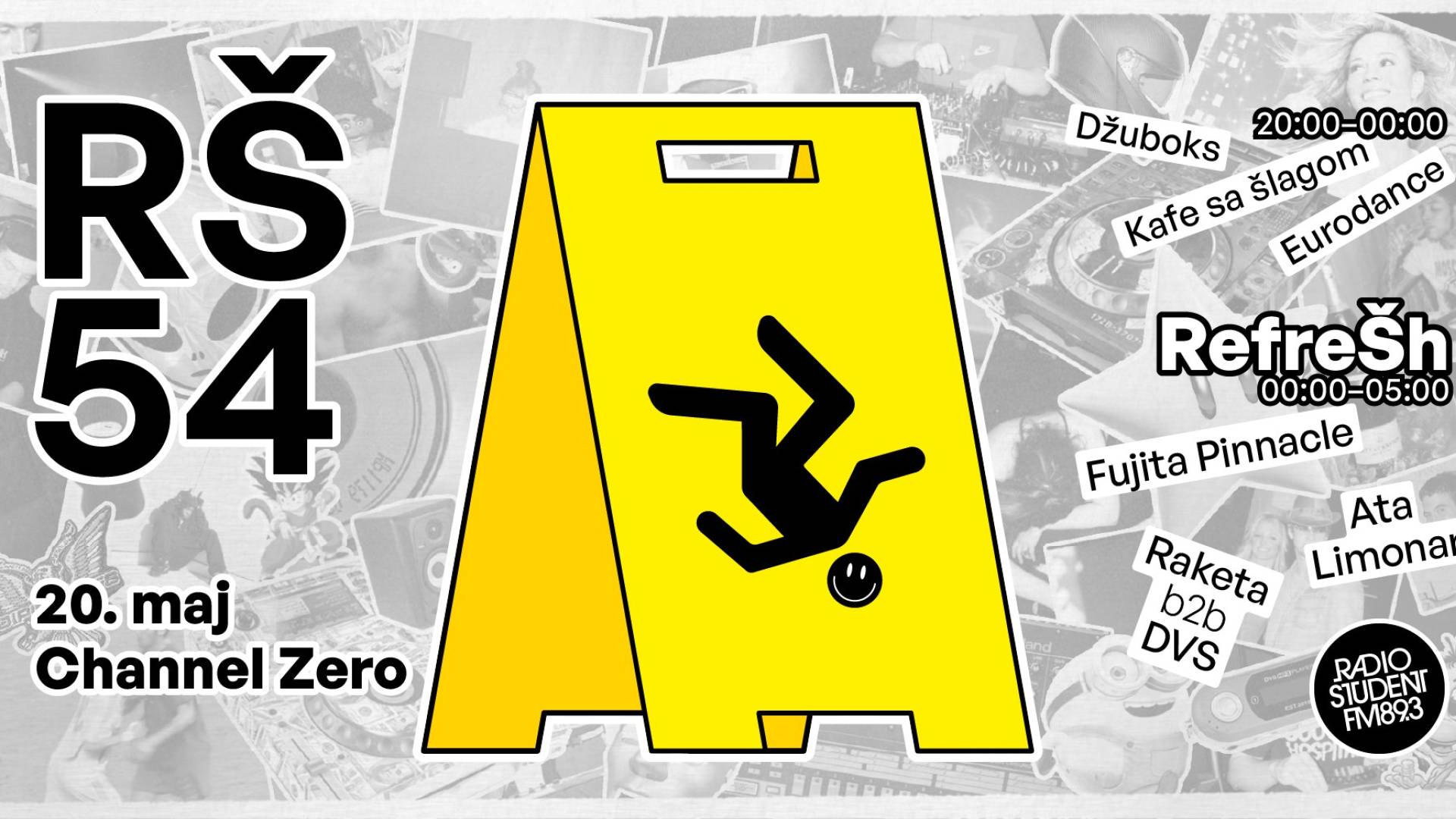 Najprej s džuboksom in ležernim druženjem, zanju bo pred klubom CH0 poskrbela glasbena redakcija RŠ. Po difuziji bomo v notranjosti kluba na plesišču najprej spili eno kafe sa šlagom, za tem pa sledi eurodance, ob polnoči pa vajeti v svoje roke prevzema ekipa Channelove serialke Refresh, ki jo vsak drugi petek zvečer lahko v Vibe Checku in DVS MP3 Playerju slišite na valovih Radia Študent: Ata Limonar, Fujita Pinnacle, Raketa b2b DVS. Ob tej priložnosti kakopak s 100 % RŠ zasedbo!