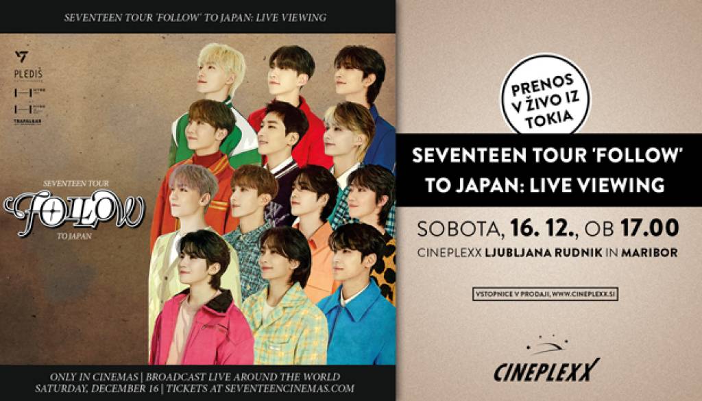 Cineplexx Ljubljana RudnikPridružite se nam na turneji skupine SEVENTEEN - FOLLOW v živo preko satelitskega prenosa iz Japonske, v soboto, 16.12.2023, ob 17:00, v CINEPLEXXU LJUBLJANA RUDNIK IN MARIBOR!