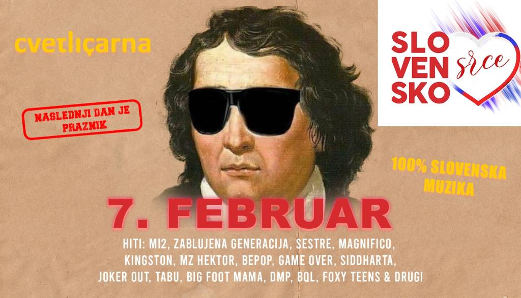 Na predvečer slovenskega kulturnega praznika v Cvetličarno prihaja edino, kar se ob takšni priložnosti spodobi: največja klubska zabava s slovenskimi žurerskimi hiti do zdaj - vseh žanrov in vseh generacij!