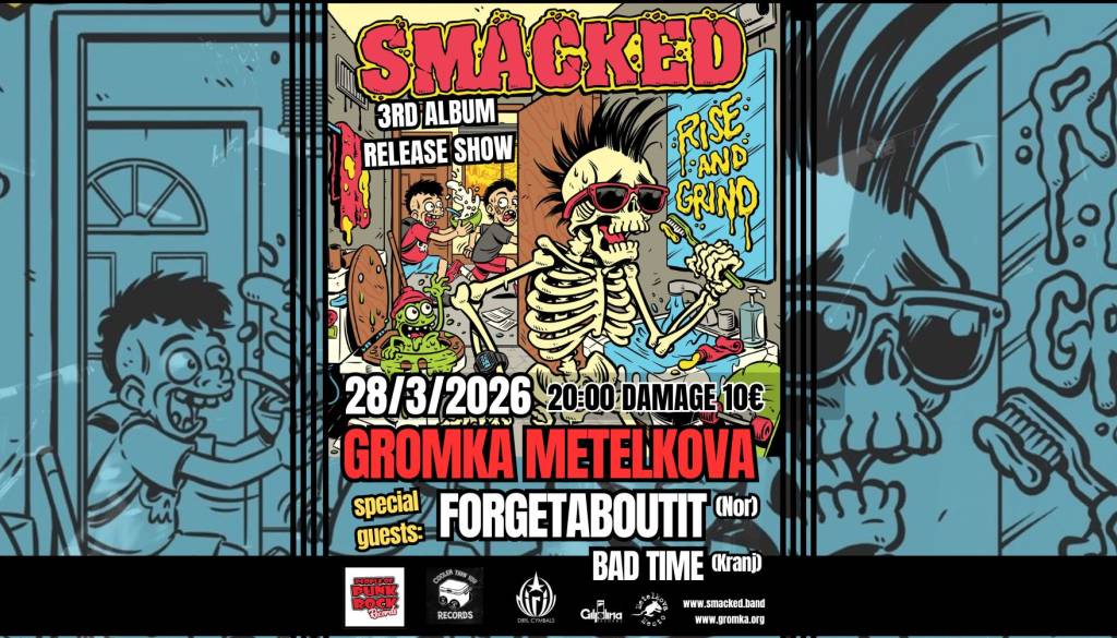 Klub Gromka, AKC MetelkovaVabljeni na praznik skate punka v Klub Gromka, na Metelkovo! Nazdravili bomo novemu albumu skupine Smacked in začetku njihovega sodelovanja s kanadsko založbo Cooler than you Records / People of Punk Rock Records skupaj z njihovimi prijatelji iz evropskih turnej Forgetaboutit iz Norveške in kranjskimi Bad time!