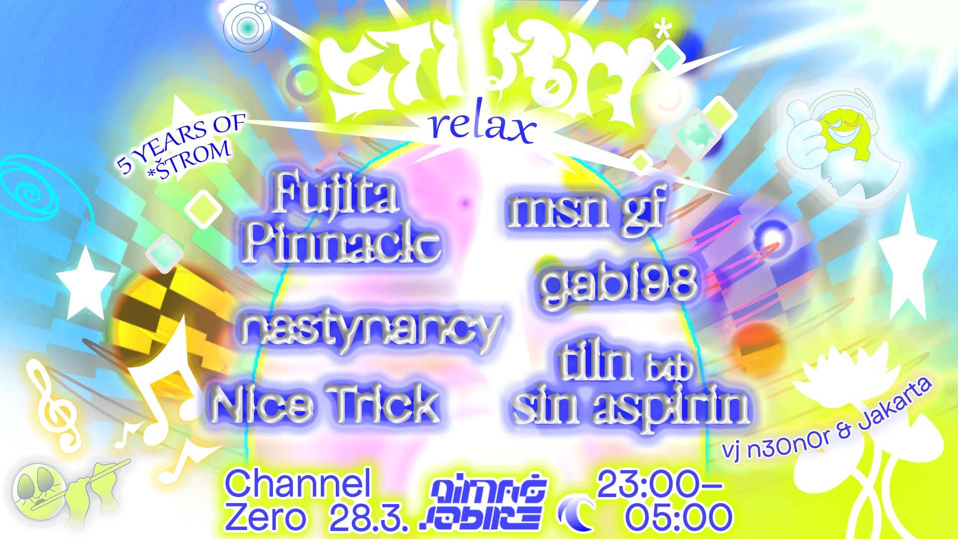 KUD Channel ZeroOb praznovanju (približne) 5. obletnice delovanja zloglasne serijalke Štrom, ki je vsa ta leta neumorno in vztrajno tresla ljubljansko podtalje elektronske glasbe, smo se člani gostujočega Nimaš Izbire kolektiva poglobili sami vase in ugotovili, da je skrajni čas za oddih. V vseh teh letih polnih izzivov, porazov in zmag ter predvsem neštetih tako bolj kakor manj mednarodno prepoznavnih umetnikov v gostovanju se zna hitro zgoditi, da se izgubi fokus na to kar je zares pomembno… Zato smo se odločili tokratni večer v zahvalo posvetiti naši celotni razširjeni skupnosti, ki je vsa ta leta delovanja spremljala in omogočala. Prvič v zgodovini bo tako glasbo brezkompromisno sukala 100% zasedba naših DJskih rezidentk in rezidentov, kolektivno podkovanih z najdragocenejšimi izkušnjami iz domačega terena. Prav zares dragi kolegi in kolegice; veseli bomo vaše prisotnosti na proslavi strasti do dobre glasbe, divjega plesa in izbrane družbe ob 5. Jubileju delovanja našega in vašega Štroma <3