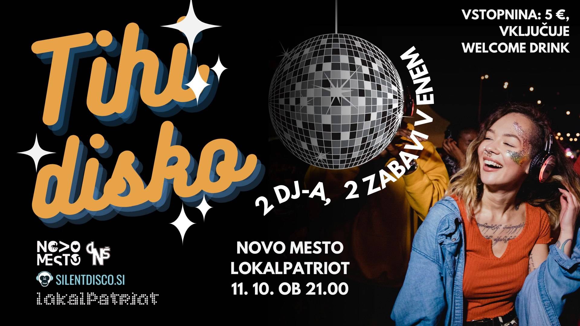 Tihi disko je kot običajna diskoteka, vendar ne razjezi sosedov in združuje dve zabavi v enem. Tako lahko skupaj zažuraš tudi s prijatelji, ki imajo povsem drugačen okus za glasbo. Glasba je v slušalkah, na vsakem kanalu pa je drug DJ. 😉 Pridruži se nam in odkrij nekaj novega!