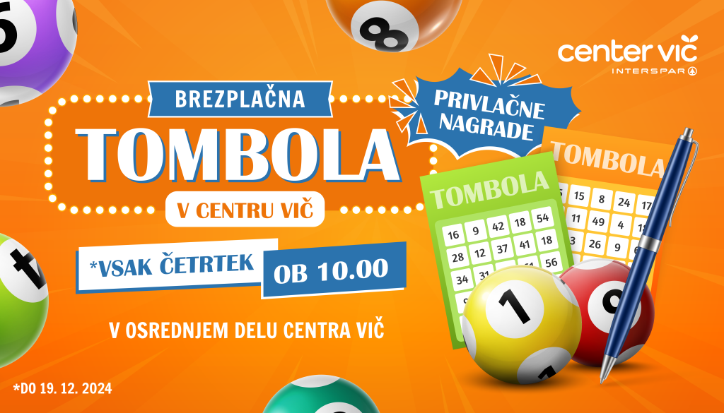 Center VičPridružite se nam v četrtek, 5. decembra 2024 ob 10. uri v osrednjem prostoru Centra Vič na posebni praznični tomboli! Čaka vas obilica zabave, čudovite nagrade in praznično vzdušje, ki bo popestrilo vaše decembrsko dopoldne.