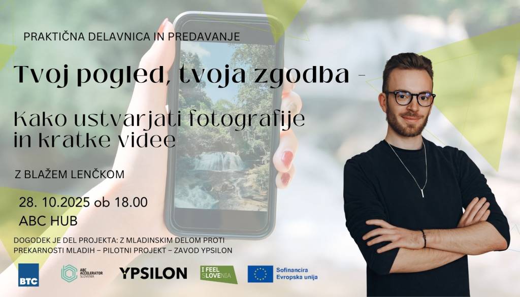 ABC Hub učilnica, Latinski trg 6, 1000 LjubljanaZavod Ypsilon vabi na praktično delavnico fotografiranja in snemanja za družbena omrežja, kjer boste od profesionalnega fotografa Blaža Lenčka izvedeli, kako ustvariti vizualne vsebine, ki pritegnejo pozornost in izstopajo med poplavo objav.