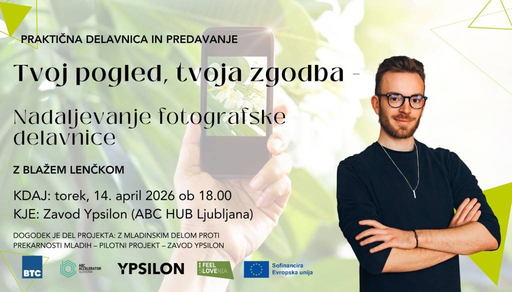 Zavod Ypsilon, ABC HUB; BTC; LjubljanaZavod Ypsilon vabi na praktično delavnico fotografiranja in snemanja za družbena omrežja. Profesionalni fotograf Blaž Lenček bo pokazal, kako s telefonom ustvariti kakovostne fotografije in videe – od nastavitev do kadra in svetlobe.