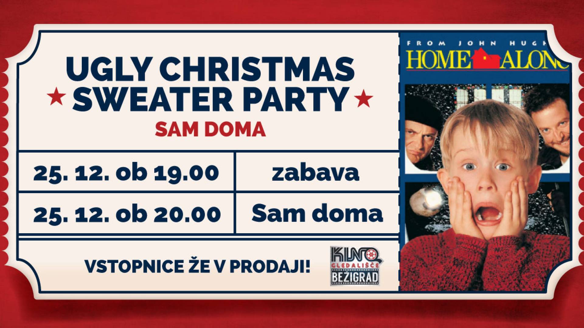 Kino BežigradČas je za našo najljubšo decembrsko tradicijo – božič z večnim kraljem prazničnih filmov: Sam doma! 🎅 Naš nesmrtni decembrski ritual bo s parado najgrših božičnih puloverjev seveda pospremil Ugly Christmas Sweater Party. ✨ Babičin kičast pleten pulover bo končno dobil svoj “moment” – nosite ga ponosno! 🤶🧶💁♀️