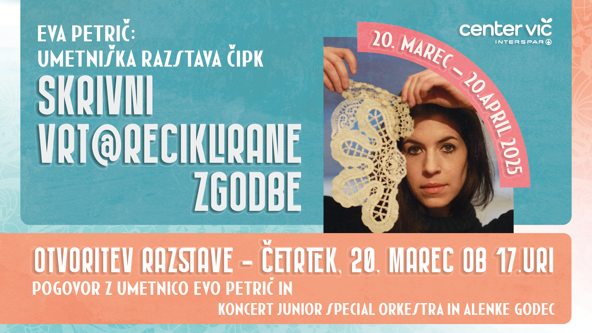 Center Vič od prvega pomladnega dne do Velike noči za obiskovalce poleg nakupovalnega pripravlja tudi izjemno umetniško doživetje. Z razstavo Skrivni vrt@Reciklirane zgodbe se bo predstavila multimedijska umetnica Eva Petrič, sicer prejemnica več mednarodnih nagrad. Otvoritev bo v četrtek, 20. marca, ob 17. uri v Centru Vič (Jamova cesta 105, Ljubljana). Center Vič bo tako postal prva nakupovalna destinacija z razstavo umetnice, razpete med Ljubljano, Dunajem in New Yorkom. V okviru odprtja bo potekal pogovor z Evo Petrič, nastopili pa bodo Alenka Godec in glasbena poslastica s koncertom Junior Special Orkestra, katerega člani so večinoma srednješolci Konservatorija za glasbo in balet.