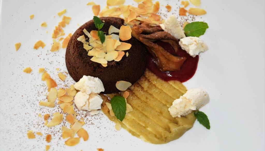 Čokoladni fondant z belo čokolado, domač sladoled s kavo, karamelizirani orehi
