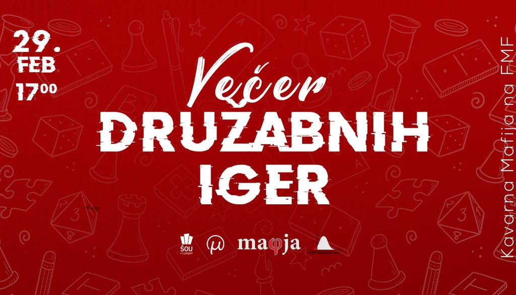 Izpitno obdobje je za nami, zato ŠO Mafija ponovno vabi vse ljubitelje namiznih iger v kavarno Mafijo, saj za vas spet organiziramo večer družabnih iger! ♟️♟️♟️ ⏰Kdaj? V četrtek, 29. 2. 2024 ob 17.00 📍Kje? V kavarni Mafija ♟️♟️♟️ 🃏Na voljo bodo razne družabne igre kot so tarok, šah, spletke, catan, d&d, enka, codenames in druge. Za hrano in pijačo bo poskrbljeno.🍿🥤 Pridruži se nam!🃏