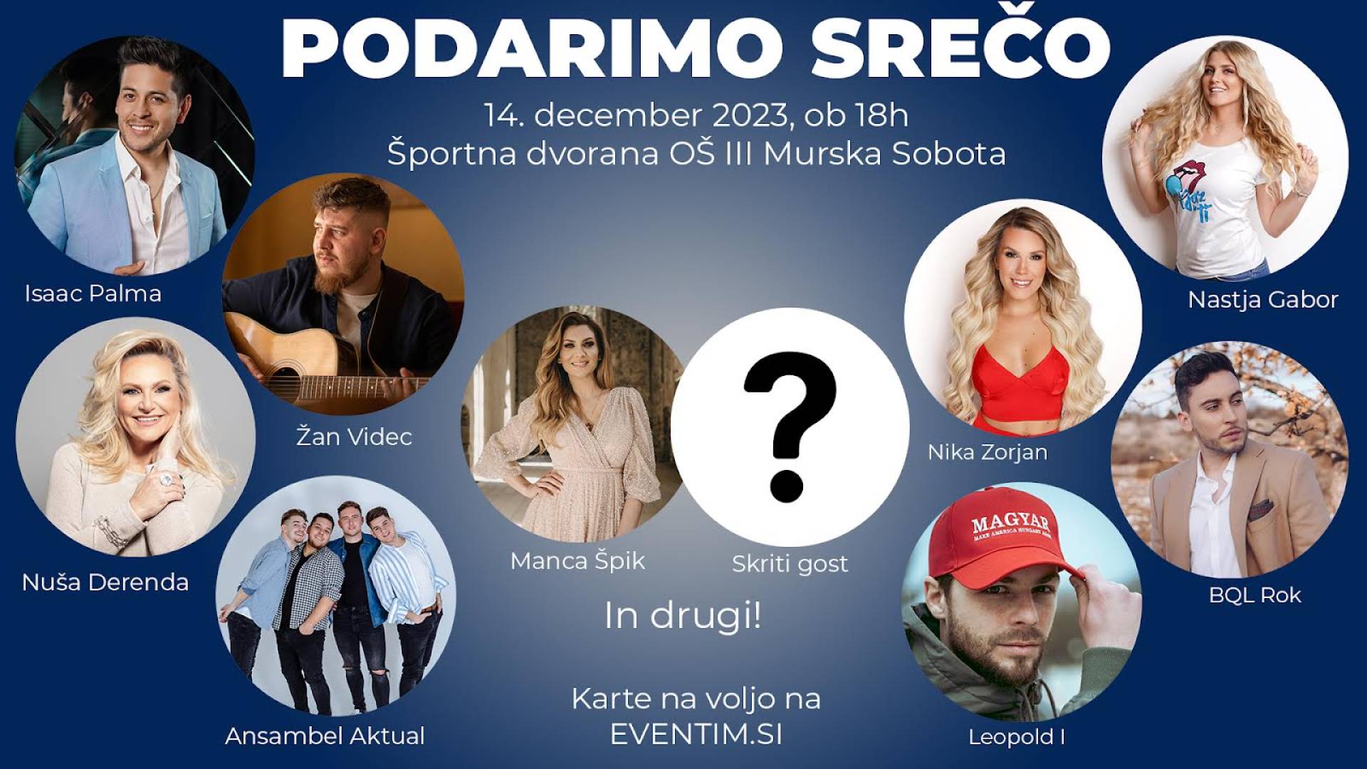 Športna dvorana OŠ III Murska SobotaZ nami bodo NUŠA DERENDA, ISAAC PALMA, MANCA ŠPIK, NIKA ZORJAN, LEOPOLD I., ROK BQL, NASTJA GABOR, ANSAMBEL AKTUAL, ŽAN VIDEC ... + SKRITI GLASBENI GOST.