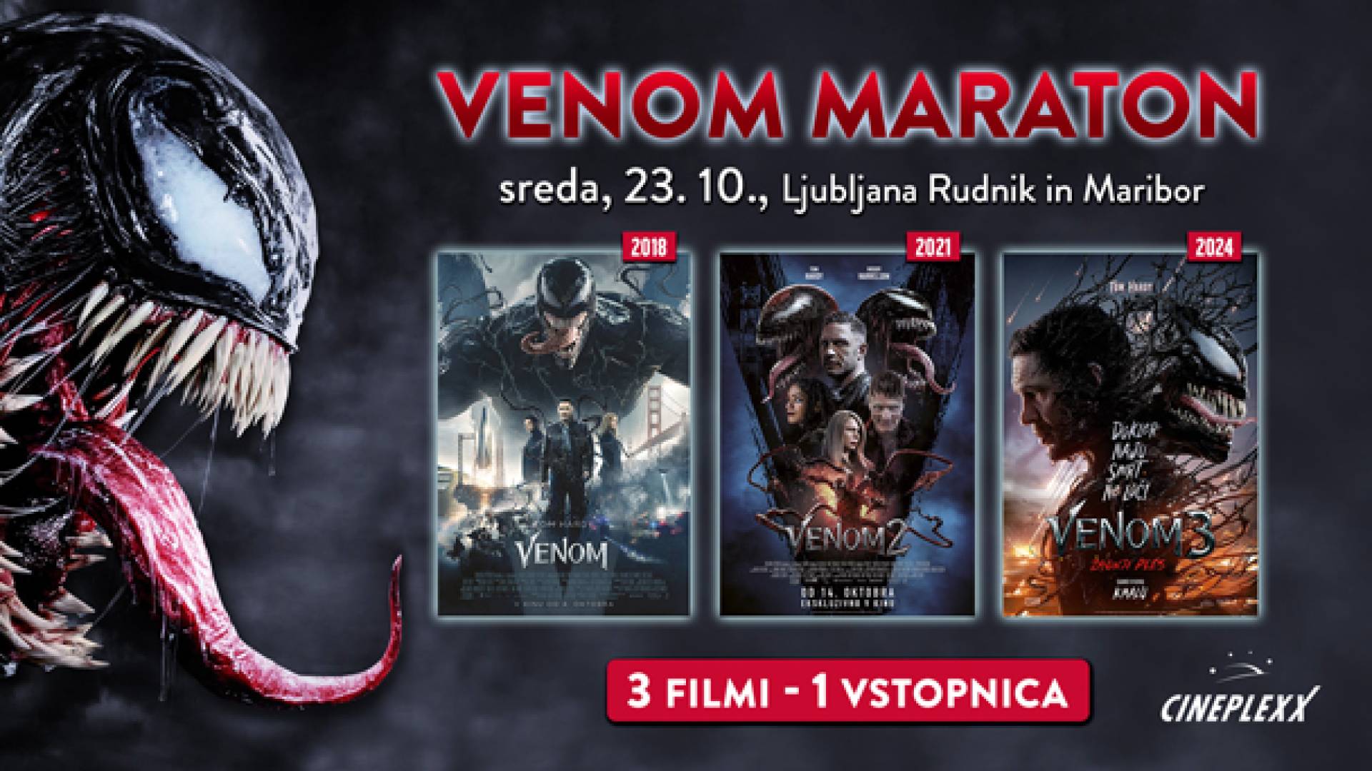 VENOM MARATON bo samo v sredo, 23. oktobra 2024 ob 17:30. Ena kino vstopnica vam zagotavlja ogled vseh treh filmskih uspešnic: Venom (Venom) 2018, Venom 2 (Venom: Let There Be Carnage) 2021 ter Venom: Zadnji ples (Venom: The Last Dance) 2024.