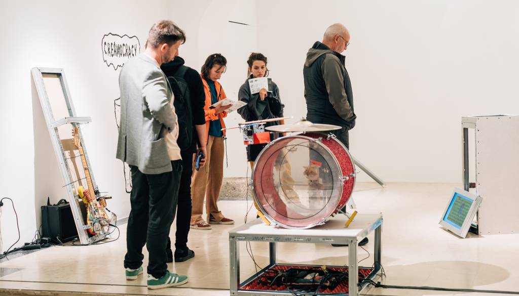 K postavitvi veliko prida tudi sam prostor Galerije Vžigalica, ki s svojimi historičnimi arhitekturnimi posebnostmi – oboki, pilastri, prehodi – deluje kot zvočna votlina, resonančni prostor za preplet perspektiv in umetniških izrazov, za doživljanje razstave skozi več enakovrednih medijev: risbe, objekte, video, zvok, obrazstavno zloženko in besedila.