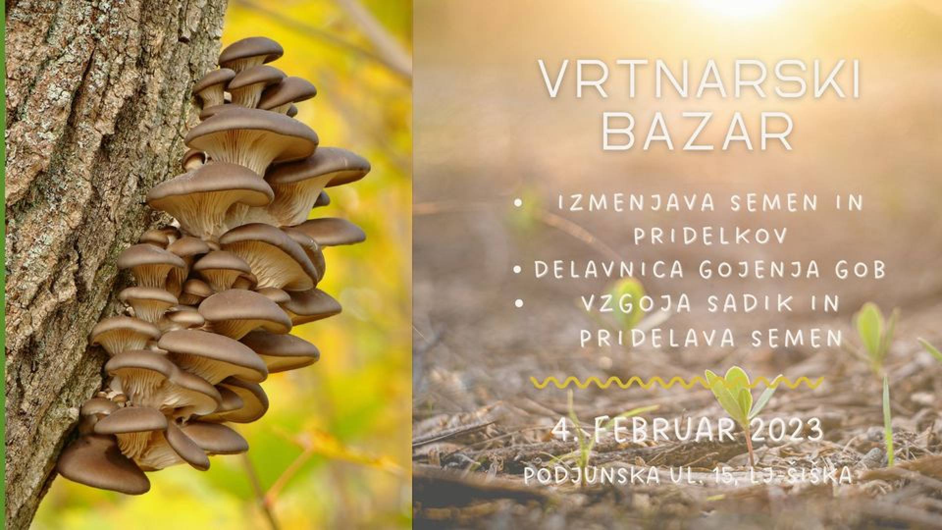 Vabljeni na uradni začetek vrtnarske sezone 2023, ki jo bomo v februarju začeli z družabnim dogodkom Vrtnarski bazar! Na našem bazarju te pričakujeta dve poučni delavnici, toplo kosilo in druženje, ime bazar pa ne bi bilo pravo, če ne bi tudi nekaj “trgovali”. Tako, da si vabljen/a, da prineseš za izmenjat svoja semena in druge vložnine, ki jih imaš v presežku. Na bazarju bo mogoče kupiti tudi domače ekološko olivno olje, pridelano v Slovenski Istri iz avtohtone istrske belice.