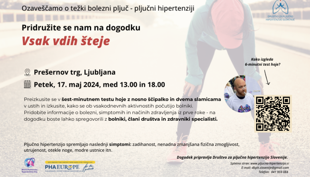 Ljubljana Prešernov TrgDruštvo za pljučno hipertenzijo Slovenije v petek, 17. maja 2024 na Prešernovem trgu v Ljubljani pripravlja dogodek Vsak vdih šteje, s katerim želi ozaveščati o težki bolezni pljuč – pljučni hipertenziji.