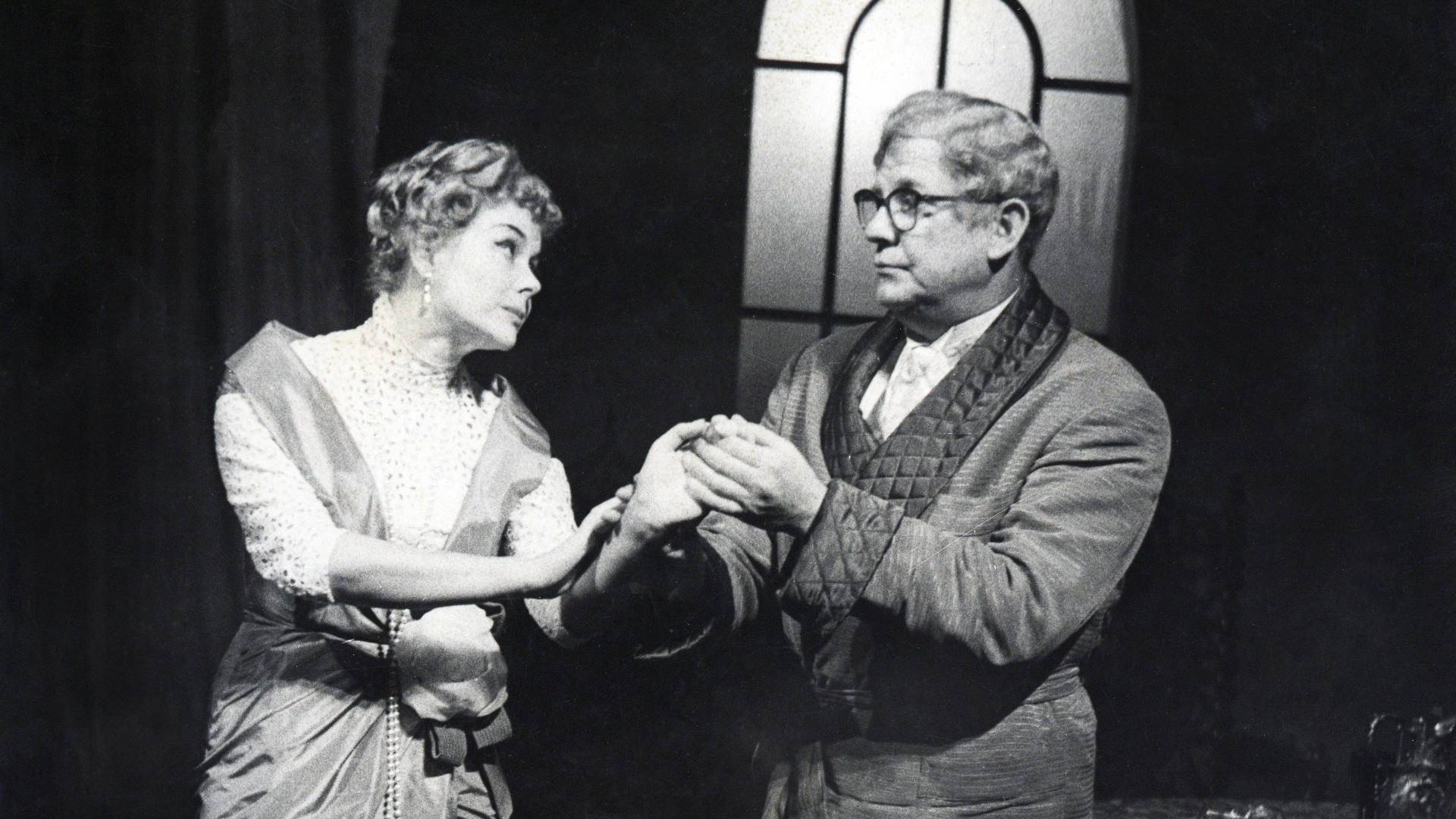 Fotografija: Duša Počkaj kot Helena in Stane Sever kot Aleksej pl. Gornik v: Ivan Cankar, Za narodov blagor, r. Mile Korun, Drama SNG v Ljubljani, 1958/59. Foto: Vlastja Simončič; vir: Ikonoteka SLOGI – Gledališki muzej.