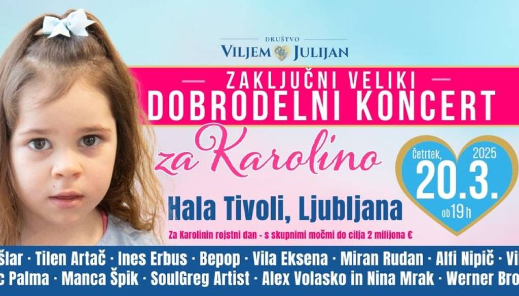 Hala TivoliTo bo zelo poseben dogodek, saj si želimo, da bo koncert tudi zaključek naše velike zbiralne akcije, s katero zbiramo 2 milijona € za razvoj genskega zdravila za bolezen Cockayne sindrom – tip B, ki je edino upanje, da bi Karolini lahko rešili življenje. Obenem pa bo koncert tudi praznovanje Karolininega 6. rojstnega dne.