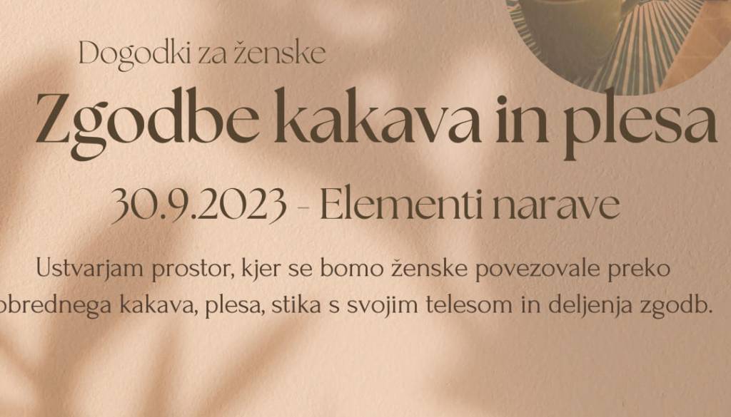 Tokrat bomo raziskovale elemente narave. Od otroštva sem bila povezana z naravo in vedno, ko sem v naravi me energijsko podpre. Skozi meditacijo in ples sem zadnja leta še globlje spoznavala elemente narave: voda, ogenj, zemlja, zrak. To spoznanje se mi je zgodilo, samo ko sem šla iz uma v sedanji trenutek. Na dogodku bomo skozi čutenje elementov, ples, pogovor odpirale uvide o sebi, saj je naše telo narava. Obredni kakav, element Mame Zemlje, nas bo podprl in odprl pri temu, da bomo prizemljene lažje šle skozi proces spoznavanja sebe.