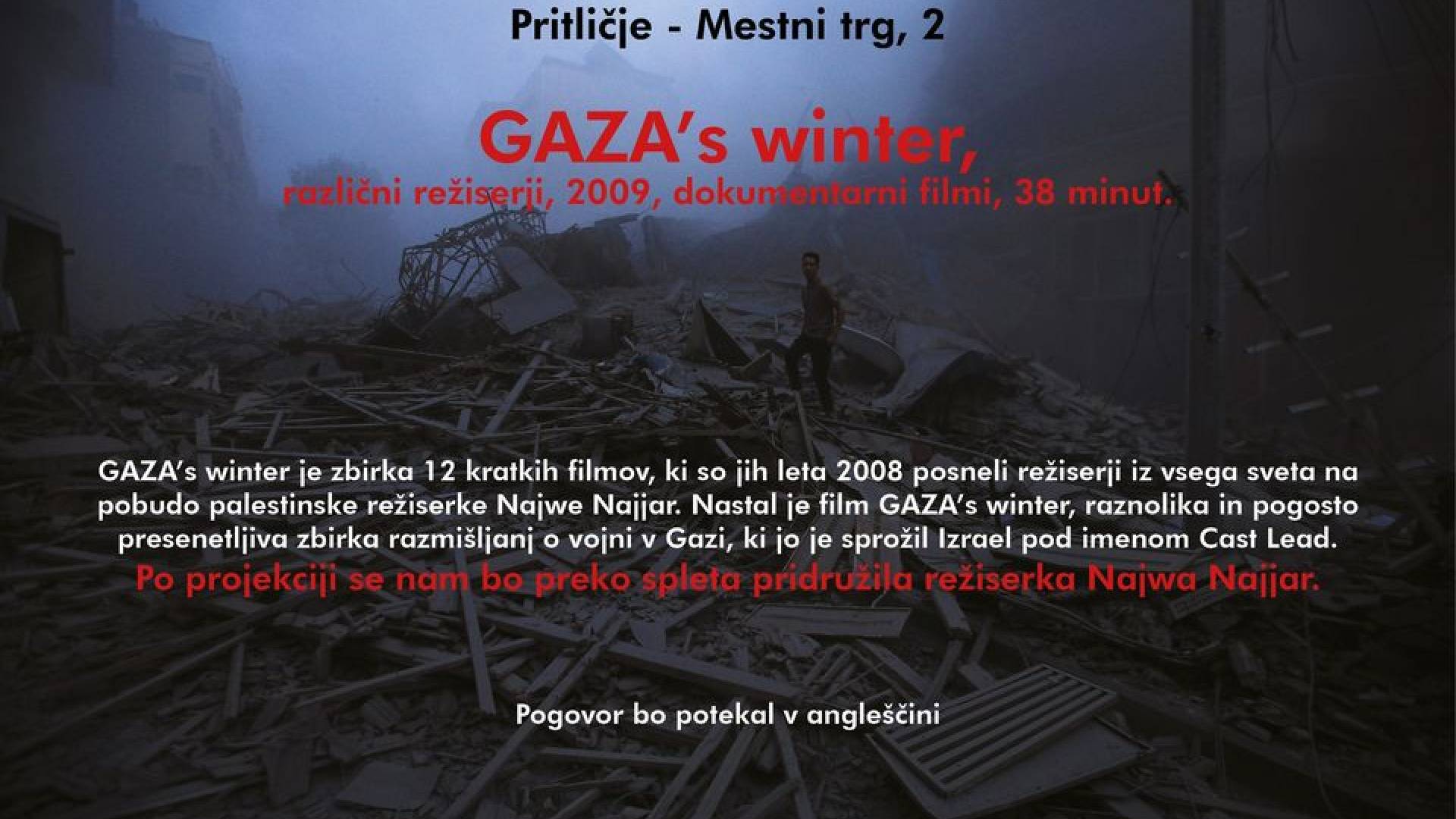 Zima v Gazi je zbirka dvanajst kratkih filmov (2009, 38 minut), ki so jih posneli režiserji z vsega sveta. Leta 2008 je zaradi bombardiranja Gaze umrlo približno 1417 Palestincev, več kot 10 tisoč domov je bilo uničenih ter na tisoče ljudi hudo trajno poškodovanih. Med to agonijo se je sestala skupina filmskih ustvarjalcev iz Ramale, da bi svoje ogorčenje usmerili v ustvarjalno kolektivno delo. Palestinska režiserka, Najwa Najjar, je filmske ustvarjalce v Palestini in izven nje povabila, da predložijo kratka dela. Nastal je film Gaza's Winter, raznolika in pogosto presenetljiva zbirka globalnih meditacij o vojni v Gazi tisto zimo.