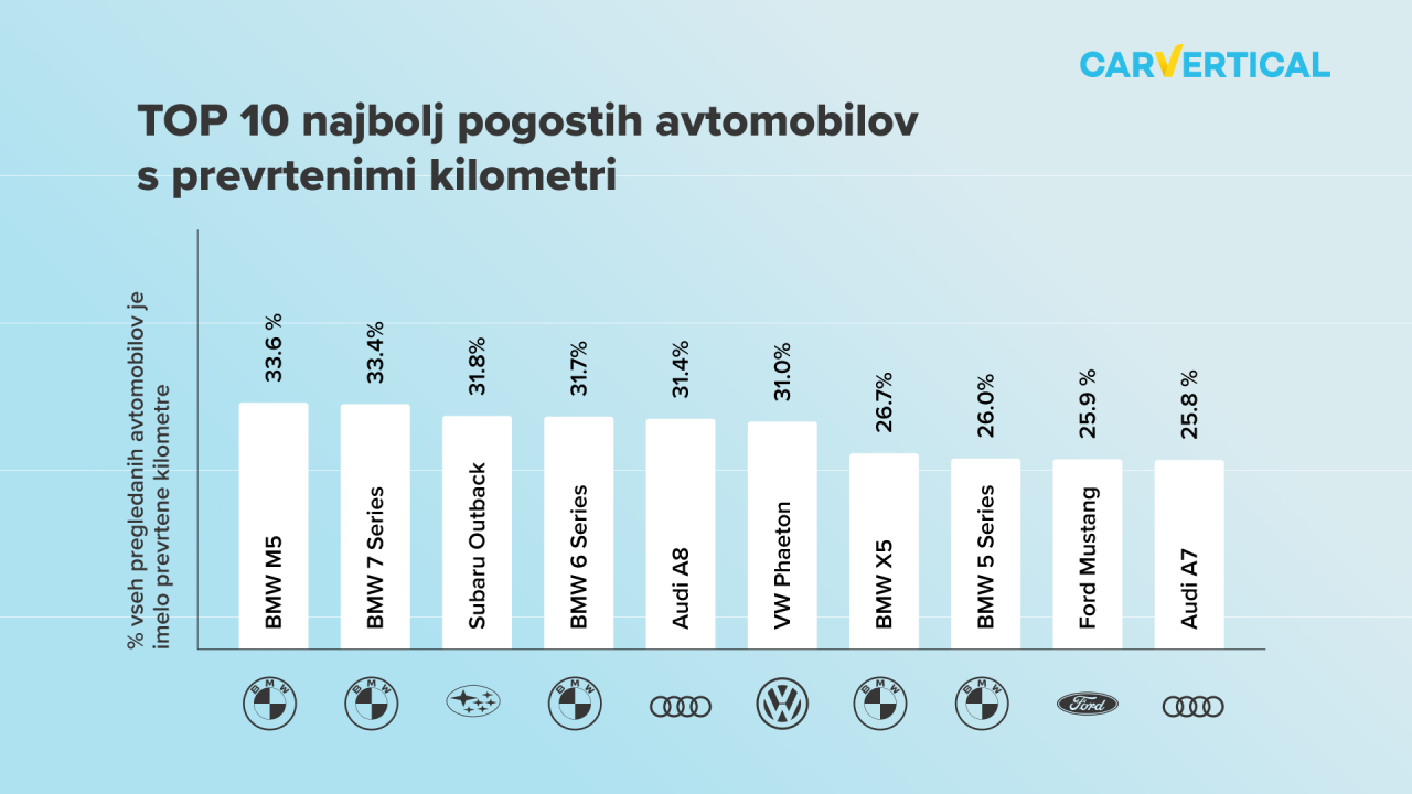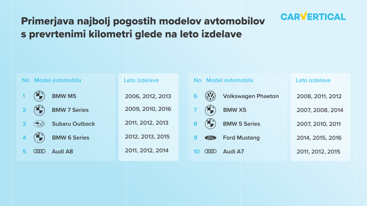 IT-podatkovno podjetje carVertical je analiziralo več kot 700.000 poročil o zgodovini rabljenih avtomobilov, pridobljenih med novembrom 2020 in novembrom 2021, in ustvarilo seznam najpogostejših avtomobilov s prevrtenim števcem.