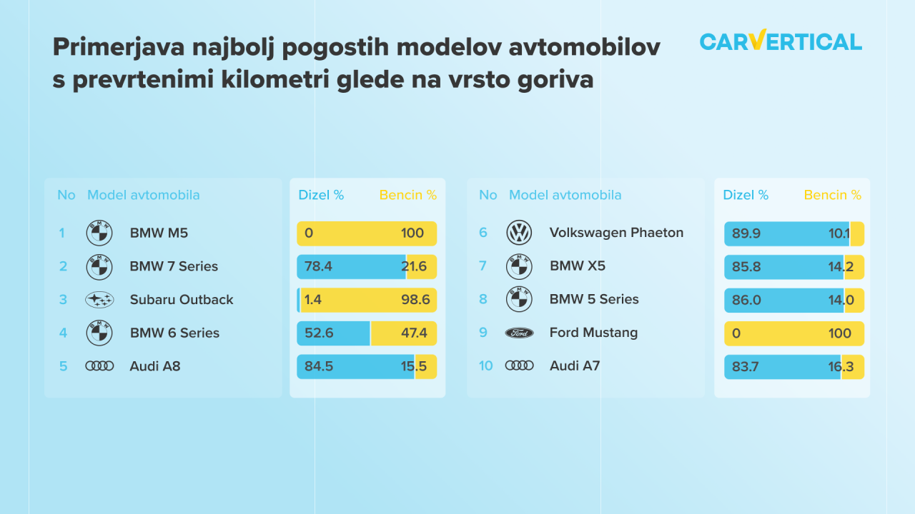 Najpogostejši model z nazaj prevrtenim števcem kilometrov je BMW M5: med preverjenimi primeri tega modela je bila več kot tretjina takšnih z nazaj prevrtenim števcem.