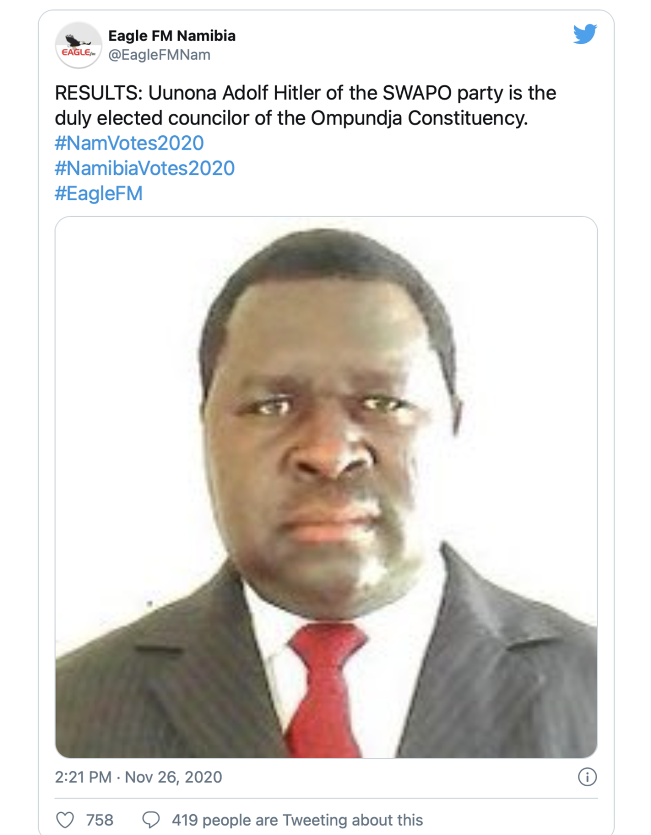 V svetu je odjeknila nenavadna novica: na lokalnih volitvah v Namibiji je slavil možakar po imenu Adolf Hitler Uunona, ki je dobil šestkrat več glasov kot njegov tekmec. V afriški državi, ki je nekoč bila nemška kolonija, je zmagal politik, ki ga je oče po pomoti poimenoval po enem najhujših zločincev v zgodovini. "Oče me je res poimenoval po njem, a najverjetneje se ni zavedal za kakšna načela se je Hitler zavzemal," je razložil po zmagi. Dodal je še, da se vedno predstavlja kot Adolf Uunona in da je hkrati prepozno, da bi si uradno spremenil ime brez zloglasnega priimka, saj je enostavno v svoji državi preveč znan.