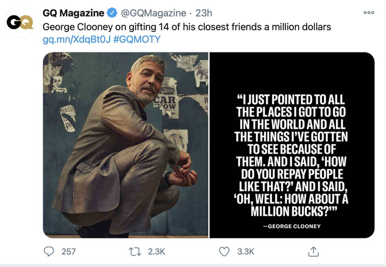 “Čestitke štirinajstim najboljšim prijateljem Georga Clooneya, prepričan sem, da so še včeraj bili vsi siromašni.”