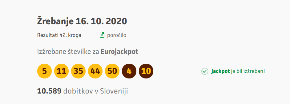 V 42. krogu Eurojackpota so bile izžrebane številke 5, 11, 35, 44, 50 ter dodatni 4, 10, kar je igralcu iz Slovaške prineslo 58.807.427,70 € dobitka.