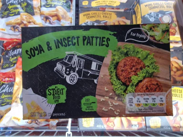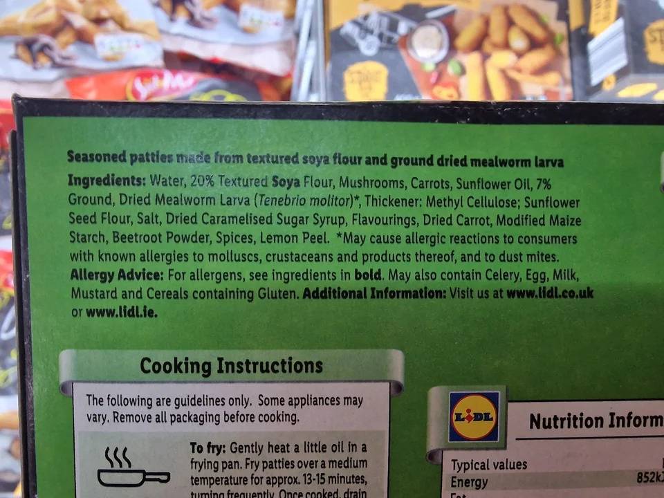 Po tem, ko so v Evropi za zdaj odobrene štiri vrste insektov za prehrano, so v Lidlu v teh dneh začeli prodajati burgerje, narejene iz insektov. Narejeni so iz sojine moke ter zmletih posušenih ličink mokastih črvov.