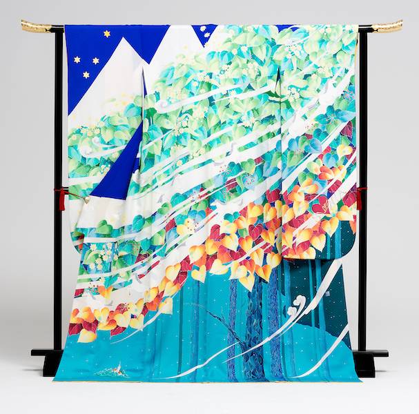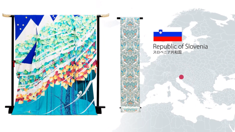 Svoj kimono je dobila tudi Slovenija. Na čudovitem, ročno izdelanem oblačilu je upodobljen motiv lipe, gozdov, Triglava, v spodnjem kotu je upodobljena cerkev na otoku Bled.