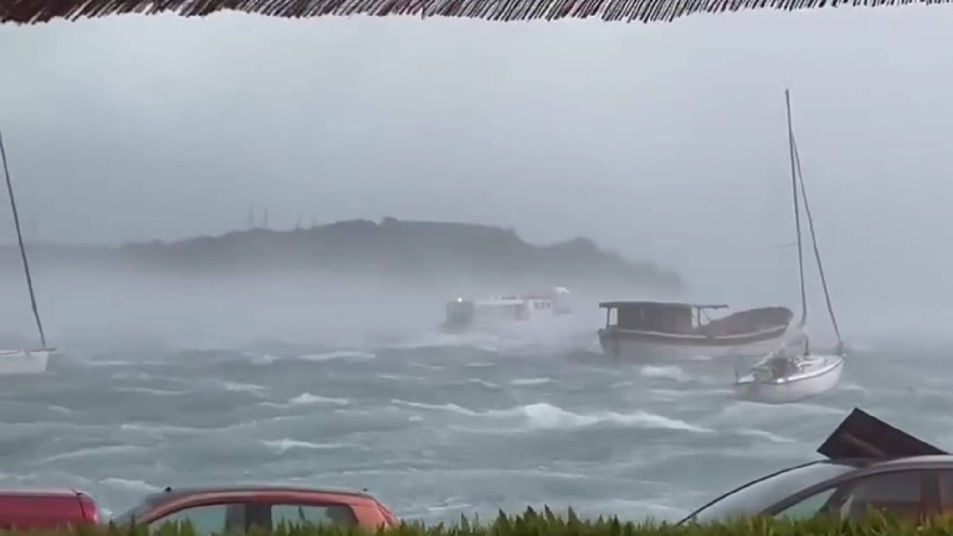 Na morju so nastali ogromni valovi, nevihtni sunki vetra pa so odnašali manjše čolne.