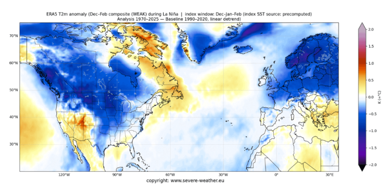 V Evropi je vpliv La Niñe posreden, saj deluje preko sprememb v atlantskih vzorcih, a vseeno prispeva k večji verjetnosti posameznih zimskih prebojev hladnega zraka.