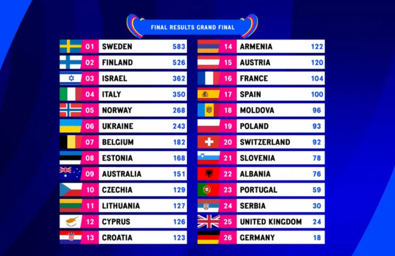 Švedinji so največ glasov namenile nacionalne žirije. Gledalce je najbolj prepričal 29-letni finski predstavnik Käärijä. Po seštevku vseh glasov, je bilo teh vseeno premalo, da bi zmago izmaknil Loreen.
