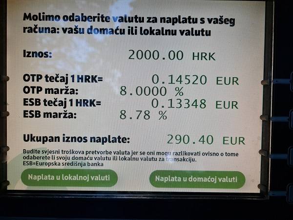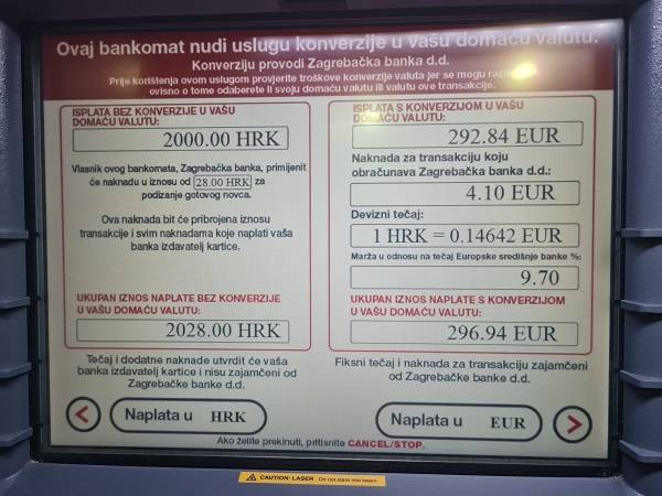 Nekateri bankomati še ohranjajo bolj jasno izbiro, kjer boste boljšega tečaja deležni, če izberete »naplata u HKR« - lokalna valuta, torej plačilo v hrvaških kunah: