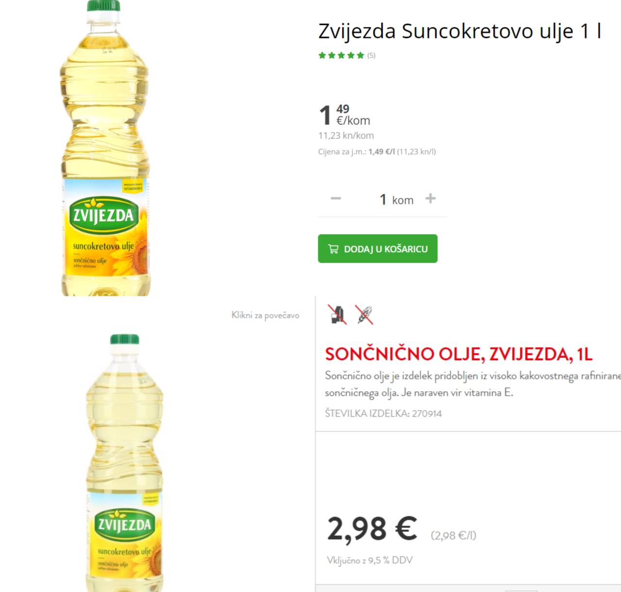 Kot je razvidno iz spodnje fotografije, je cena za liter sončničnega olja Zvijezda v hrvaškem Konzumu 1,49 evra, medtem ko je cena istega olja v slovenskem Mercatorju 2,98 evra.
