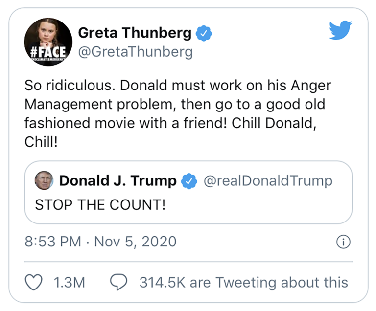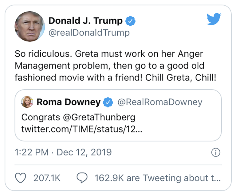 17-letno Greto Thunberg je revija Time lani izbrala za osebnost leta, kar je razjezilo tudi Donalda Trumpa, ki je bil mnenja da naziv pripada njemu. “Smešno. Greta Thunberg mora delati na svojih težavah z jezo in si nato ogledati film v družbi prijatelja! Skuliraj se, Greta, skuliraj,” je takrat twitnil.