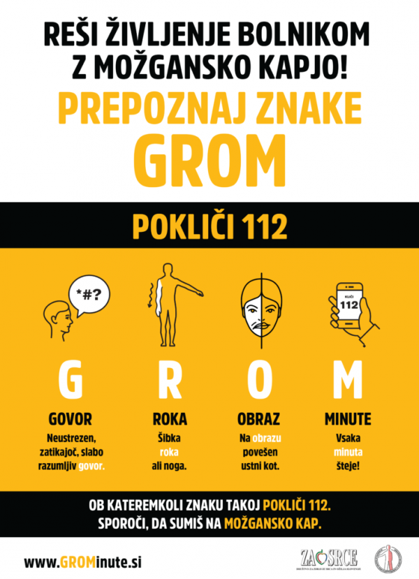 Znake možganske kapi prepoznamo s pomočjo besede GROM. Kadar opazimo vsaj enega od teh znakov, je nujno ukrepati in takoj poiskati zdravniško pomoč.