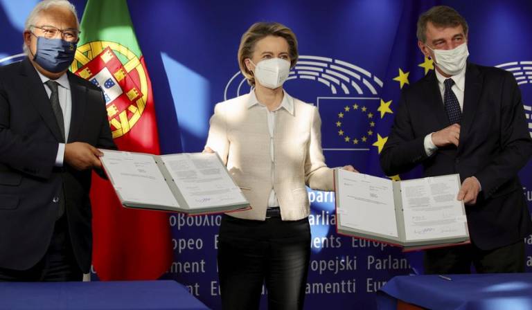 Predsednik Evropskega parlamenta in portugalski premier sta v Bruslju podpisala uredbo o 672,5 milijard evrov vrednem instrumentu, ki bo državam članicam Evropske unije pomagal pri okrevanju po pandemiji.