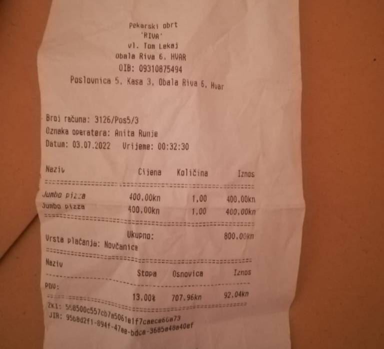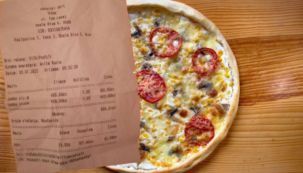 Turiste je tokrat razburil neobičajno visok račun za dve pici v pekarni na Rivi v mestu Hvar na istoimenskem otoku. Turist, ki si je želel proviščiti nočni obrok, je za dve jumbo pici moral odšteti kar 800 hrvaških kun oziroma skoraj 110 evrov.