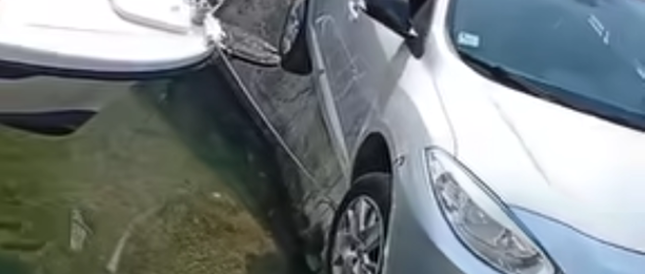 Na pomolu na otoku Brač na Hrvaškem je nekdo uspel parkirati avto tako, da ima dve gumi lepo na trdni površini, drugi dve pa nevarno visita nad robom – skoraj kot bi se voznik odločil za testno vožnjo amfibijskega vozila.