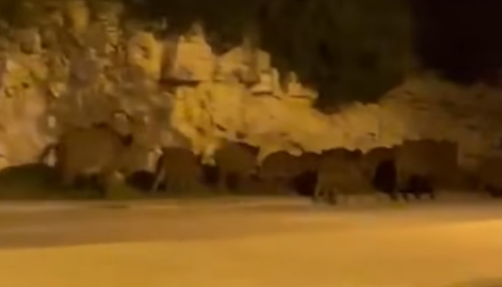 Na posnetku, ki so ga delili mimoidoči, je videti več odraslih prašičev in mladičev, kako v koloni hodijo ob skalnatem pobočju.