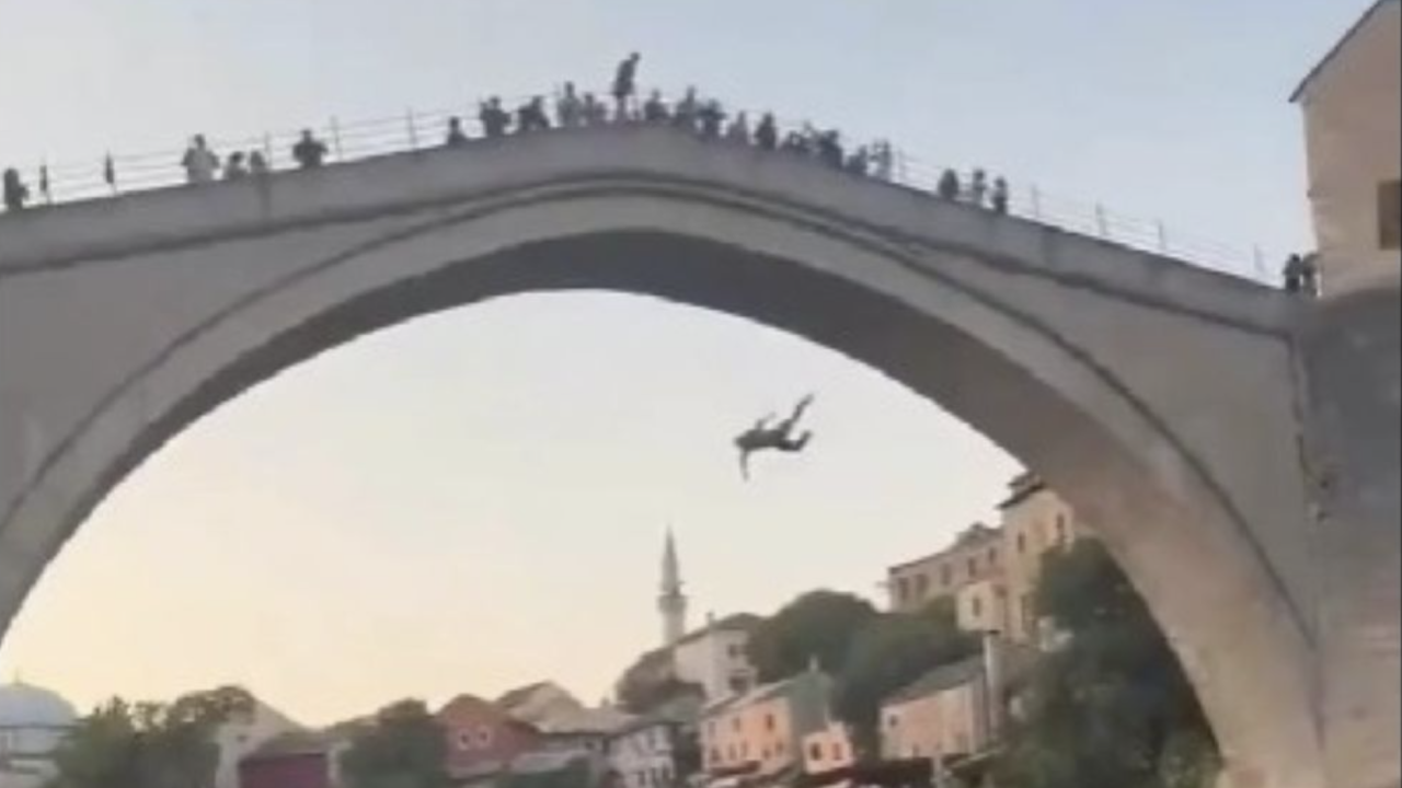 VIDEO: Turist v Mostarju izvedel nevaren skok z mostu, domačini so ga napadli