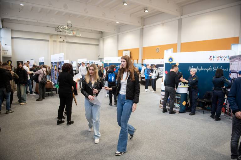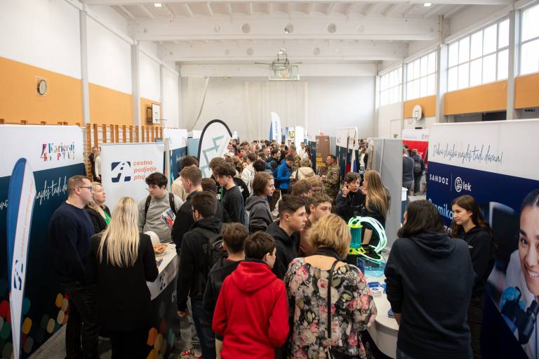 V Športni dvorani Mladika poteka predstavitev podjetij, kjer se obiskovalci lahko neposredno srečajo s predstavniki več kot 25 delodajalcev.