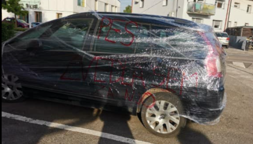 Na družabnih omrežjih so se je danes pojavile fotografije avtomobila, ovitega v prozorno plastično folijo, na njem pa sporočilo o nosečnosti ter nekaj bolj nesramnih in nevljudnih besed.