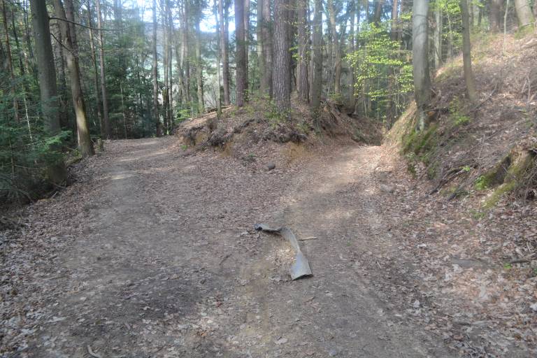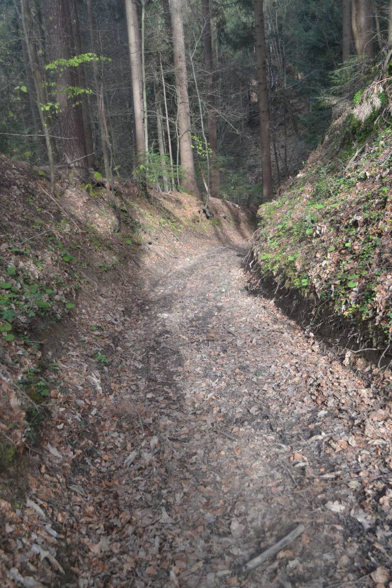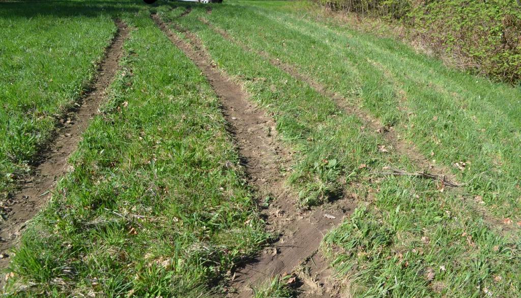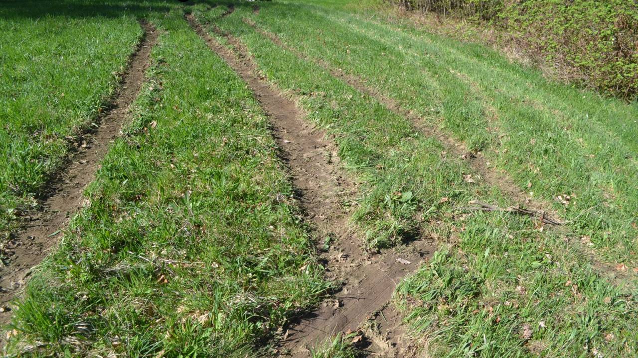 Tik pred Dobrno je z vozišča zapeljal na makadamski odcep in vožnjo nadaljeval po gozdni vlaki, nato pa z vozilom obstal na razmočenem travniku.