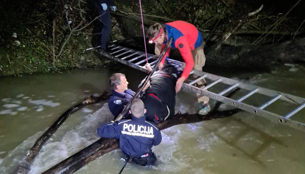 Na pomoč je priskočil tudi piranski policist. Okrog pasu so mu zavezali vrv, da ga ni odneslo po strugi reke.