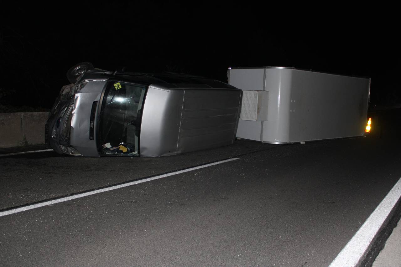 Priklopni del vozila je z desnega voznega pasu najprej zaneslo v desno, kjer je oplazilo betonsko zaščitno ograjo, nato pa še skrajno v levo, kjer je prav tako oplazilo betonsko zaščitno ograjo, nakar se je vozilo s priklopnikom prevrnilo.