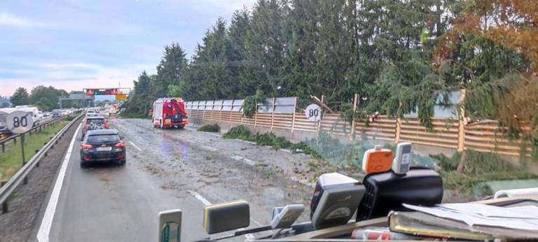 Na primorski avtocesti med razcepom kozarje in izvozom Brezovica je veter podrl več dreves. Eno drevo je padlo na osebno vozilo, pri tem pa ni bil nihče poškodovan. Na avtocesti ostaja zaprt počasni pas pred priključkom Brezovica proti Kopru, saj posledice neurja še odstranjujejo.